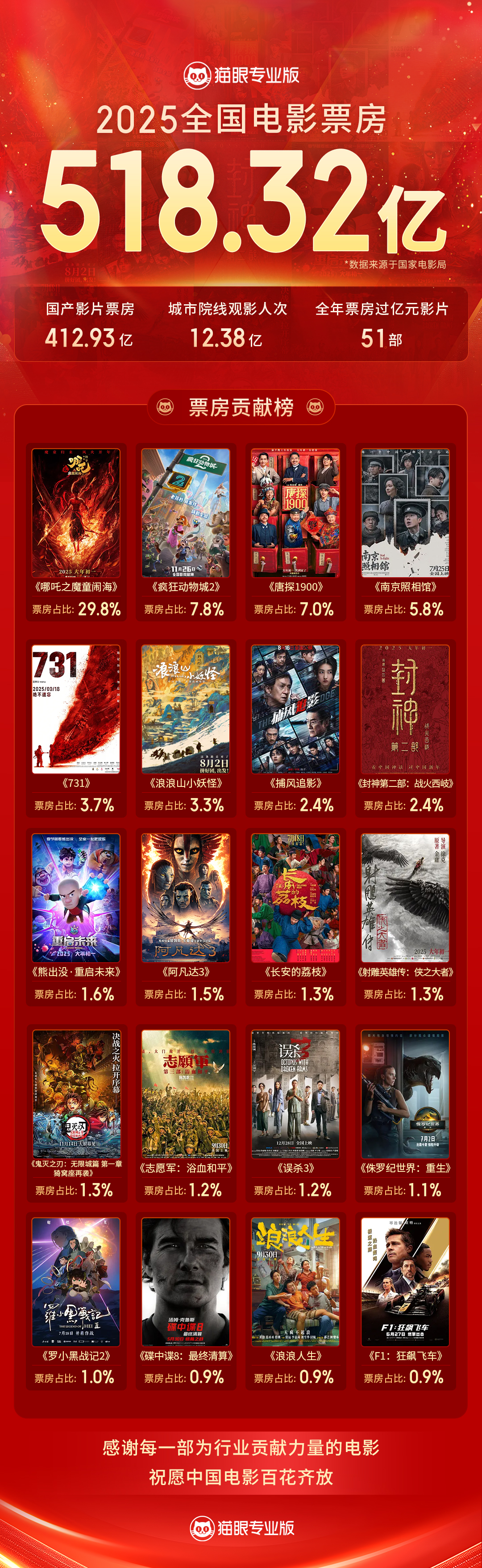 国家电影局数据显示,2025年中国电影票房518.32亿,同比上涨21.95%;观影人次12.38亿,同比上涨22.57%。其中国产片票房412.93亿,全年大盘占比79.67%。全年共生产故事片511部,共有51部影片票房破亿。年度票房前十名的影片分别为《哪吒之魔童闹海》《疯狂动物城2》《唐探1900》《南京照相馆》《731》《浪浪山小妖怪》《捕风追影》《封神第二部:战火西岐》《熊出没·重启未来》《阿凡达3》,其中国产片占据八席,进口片占据两席。
