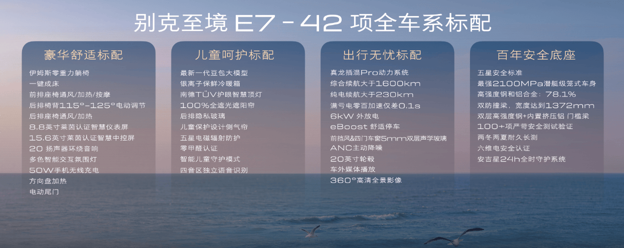 在健康与舒适性配置上,至境E7选用OEKO-TEX®母婴级健康认证材质,支持婴幼儿零距离接触或啃咬,并采用超国标VIAQ标准,获中汽中心“零甲醛”认证。车内配备南德TÜV认证护眼智慧顶灯(无频闪、三档色温),通过莱茵TÜV低蓝光护眼认证。座椅空间方面,二排垂向空间可支持身高1.2米儿童站立,全系搭载四座悬浮层座椅,支持双人大床/副驾单人床模式切换。副驾配备伊姆斯零重力躺椅,实现腹部、腿部角度双120°躺姿,前后排均带三档加热/通风功能,二排靠背支持115°-125°电调。